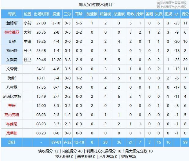 湖人:东契奇29分5板6助、詹姆斯11分3板5助、文森特11分3板1助、艾顿10分4板2助、布朗尼8分2板1助、海斯7分5板1助、蒂米6分2板、拉拉维亚6分3助2断