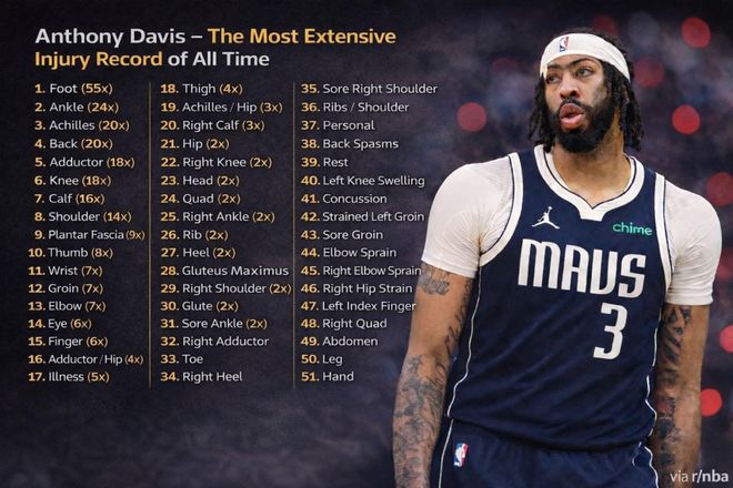 Garza表示:“戴维斯再度因左手严重伤势缺阵……他职业生涯中被记录在案的伤病已经超过285次,这笔交易的风险从一开始就显而易见。简单算笔账就知道,14个NBA赛季里出现285次伤病相关情况,平均每年超过20次。他最常见的伤病部位有哪些?脚部55次,脚踝24次,跟腱20次,背部20次。”