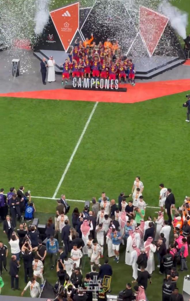 《阿斯报》发布的视频也显示,在巴萨球员捧杯时皇马球员们聚集在边线附近,待巴萨众将捧杯后,他们就离开了场地。尽管丢冠后心情低落可以理解,但拒绝为对手鼓掌并且迅速离场,姆巴佩此举确实有些失礼了。