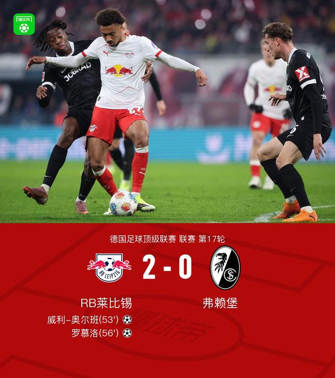 北京时间1月15日,德国足球甲级联赛第17轮,RB莱比锡坐镇主场迎战弗赖堡。上半场,赛瓦尔德撞墙配合后打门被扑;下半场,劳姆助攻奥尔班头球破门,鲍姆加特纳头球被扑后罗慕洛头球补射得手,鲍姆加特纳打门中柱。凭借这两粒进球,RB莱比锡以2比0战胜对手,全取三分。